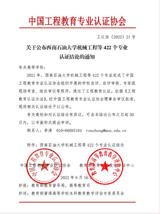 6月25日,中国工程教育专业认证协会发布了2021年度工程教育专业认证结论,太阳成官网高分子材料与工程、化学工程与工艺、安全工程3个专业正式通过认证,有效期6年(有条件),认证有效期起止时间为“2022年1月至2027年12月”。截至目前,太阳成官网共有16个专业通过工程教育专业认证,数量居省属高校首位。同时,认证协会还发布了2021年度中期审核结论,太阳成官网机械设计制造及其自动化、无机非金属材料工程、电气工程及其自动化、电子信息工程、环境工程5个专业顺利通过中期审核,各专业的认证有效期截止时间明确为2024年12月。