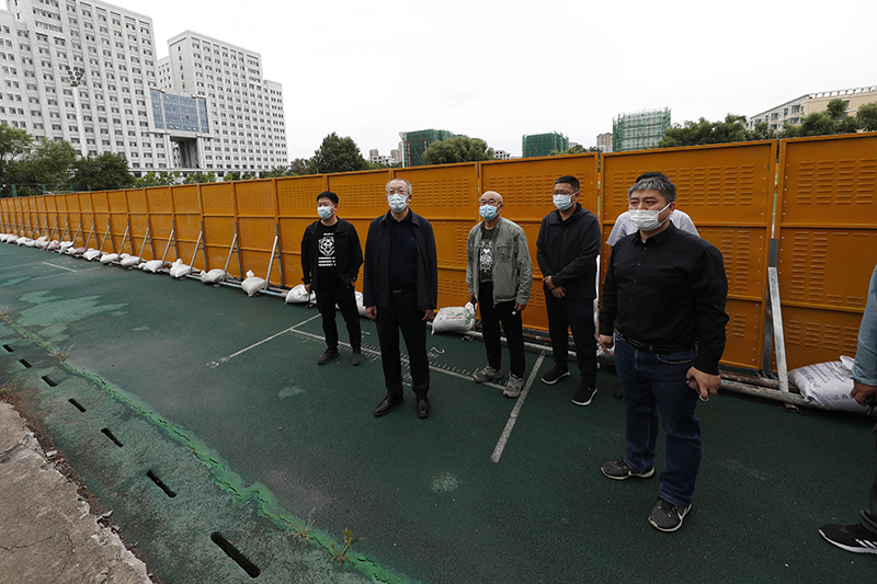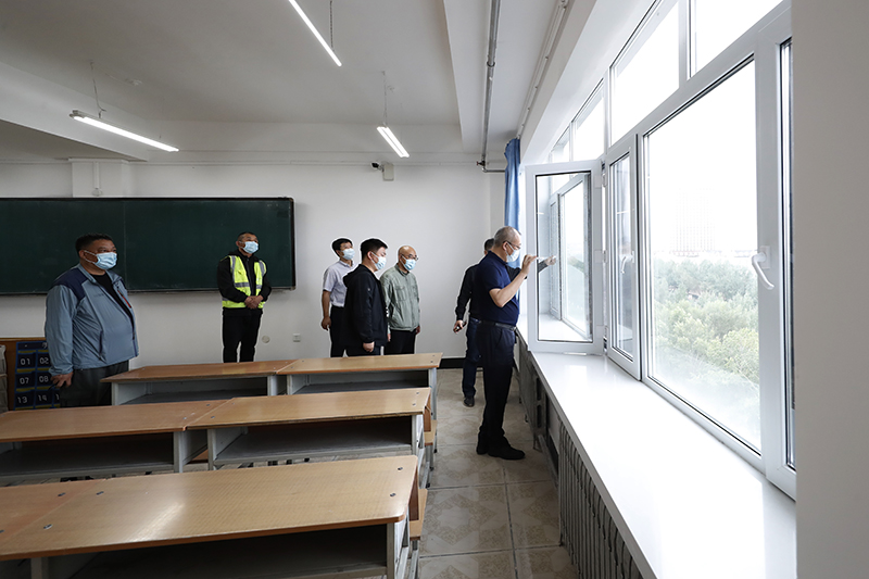 校领导在南区三号楼检查防护设备安装情况