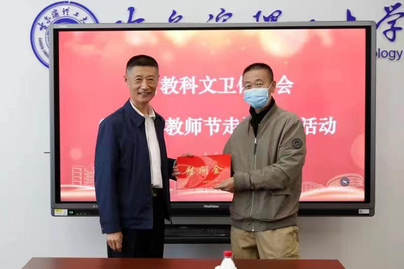 省教科文卫体工会副主席李永强,学校党委副书记郭加利、工会常务副主席王文英、副主席王立明陪同慰问。(摄影:耿洪杰)