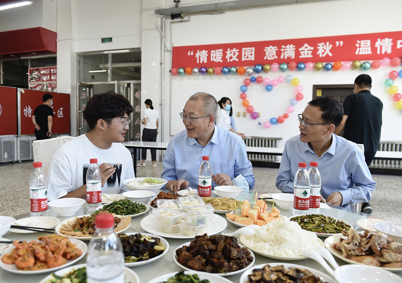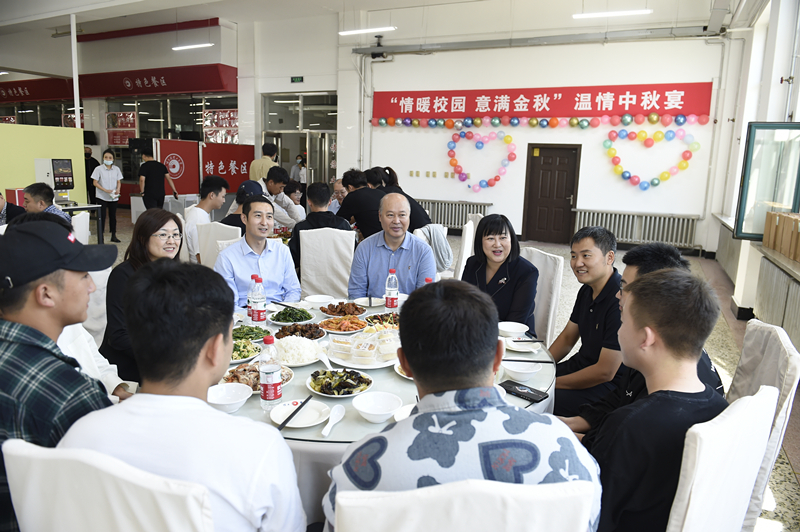 随后,领导与学生们一同落座,共同品尝学校为同学们精心准备的中秋美食。校党委书记赵琳代表学校党委向同学们致以节日的祝福,他表示今天是节宴更是家宴。受疫情影响,三批学生返校后,为了大家的安全与健康学校实行封闭管理,中秋佳节即将到来学校领导和老师非常惦念大家,以往大家都在家与父母团圆过节,而今我们师生在学校共庆中秋,希望同学们以学校为家,过一个愉快、难忘、温暖的中秋节,以解思家之情。赵书记指出,学校始终把围绕学生、关照学生、服务学生作为头等大事,希望大家能感受到理工的这份爱,把这里当做自己的家,有任何事情都可以向“家长”倾诉,不论什么时候学校都是同学们的坚强后盾,永远与大家同在。席间,各位领导与学生贴心的“话家常”,亲切询问大家的近况,关心封校期间学生们的学习和生活。其中,有位学生正好在当天过生日,食堂为其准备了一碗热腾腾的生日面,领导与同学们共同送上生日的祝福,使其非常感动,也很感谢学校的暖心安排。