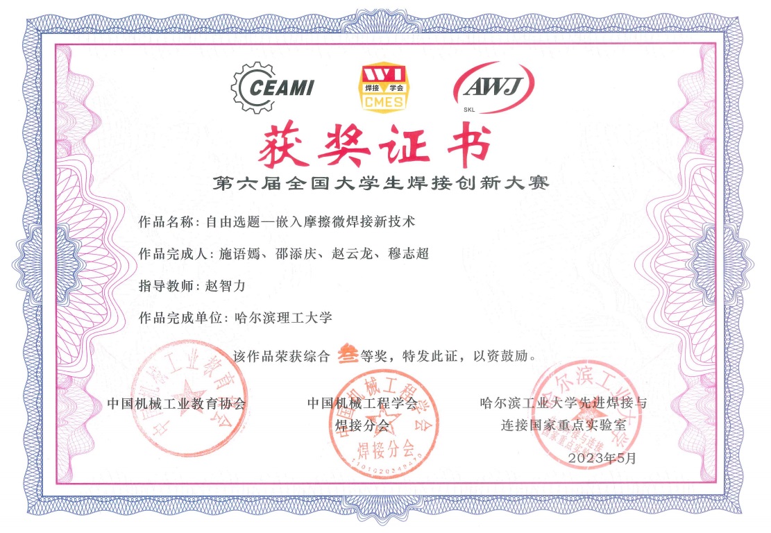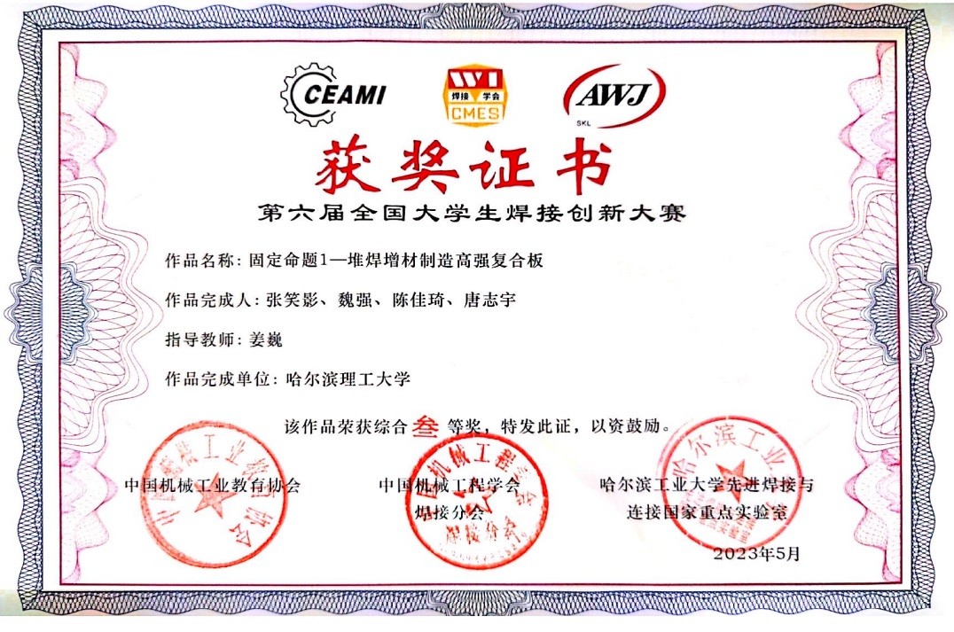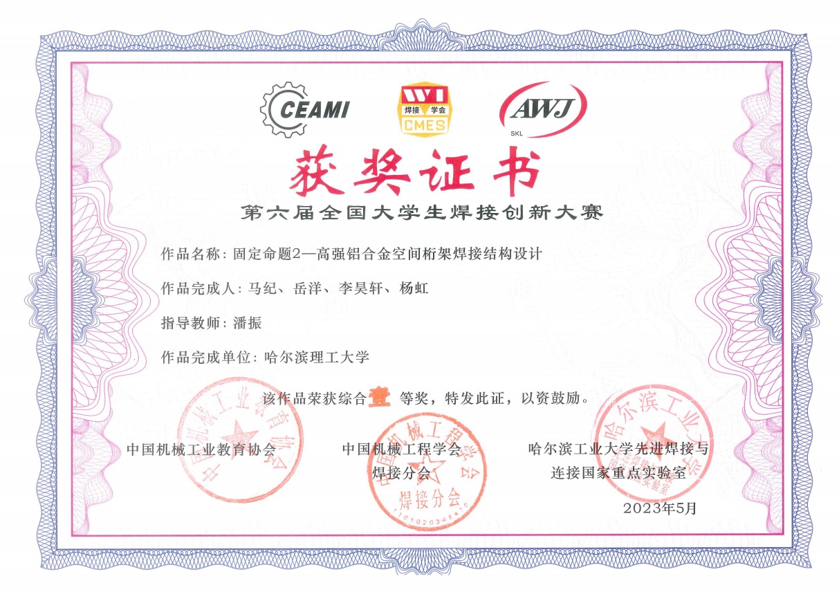 近日,第六届全国大学生焊接创新大赛暨第四届焊接技术与工程专业委员会成立大会在河南科技大学举行。中国机械工业教育协会理事长王守法,中国机械工程学会焊接分会副理事长巩水利,中国机械工业教育协会焊接技术与工程委员会主任委员方洪渊、先进焊接与连接国家重点实验室副主任黄永宪等出席开幕式。太阳成官网参赛队伍经过校内选拔和大赛组委会初评,最终材化学院材型系3支队伍参加全国总决赛。其中潘振老师的指导的马纪、岳洋、李昊轩、杨虹四位同学组成的代表队荣获大赛一等奖,姜巍老师指导的张笑影、魏强、陈佳琦、唐志宇代表队,赵智力老师指导的施语嫣、邵添庆、赵云龙、穆志超代表队荣获大赛三等奖。