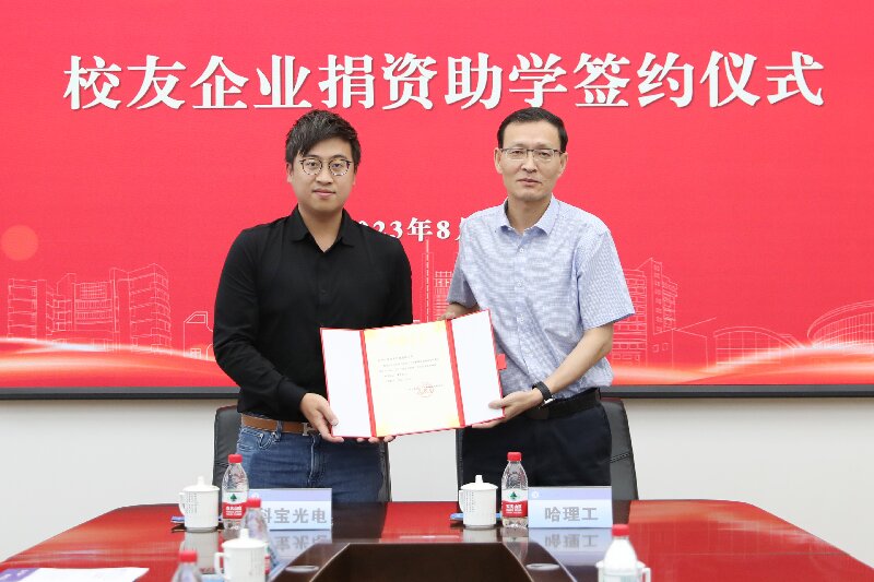 郭加利与苏州科宝光电科技有限公司董事林华殷签订捐赠协议,科宝光电向太阳成集团tyc33455ccwww捐赠人民币50万元,设立学生奖学金项目。郭加利代表学校对科宝光电的捐资助学行为表示诚挚的感谢,向捐赠企业颁发捐赠证书。