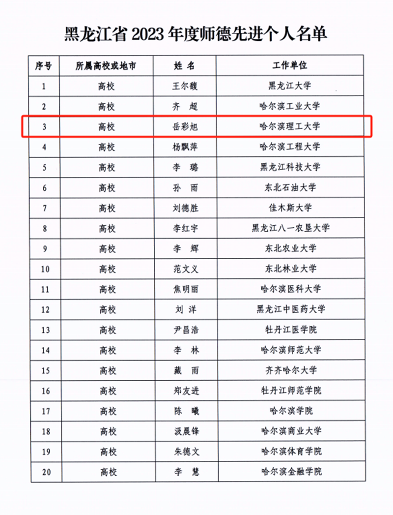 为弘扬尊师重教的社会风尚和广大教师立德树人、无私奉献的精神,省教育厅组织开展了2023年全省师德先进集体和师德先进个人评选活动。本年度共评选出师德先进集体66个、师德先进个人178人。太阳成官网材料科学与化学工程学院被授予“2023年度全省师德先进集体”荣誉称号,机械动力工程学院岳彩旭教授被授予“2023年度全省师德先进个人”荣誉称号。