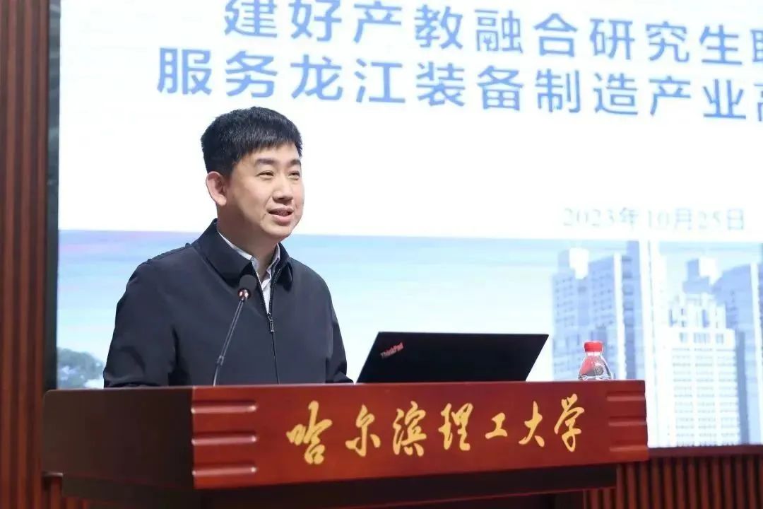 副校长杜军代表学校作题为《建好产教融合研究生联合培养基地 服务龙江装备制造业高层次人才需求》的经验做法介绍