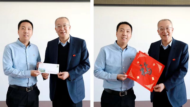 赵琳书记向张凤鸣教授送上慰问金和“福”字