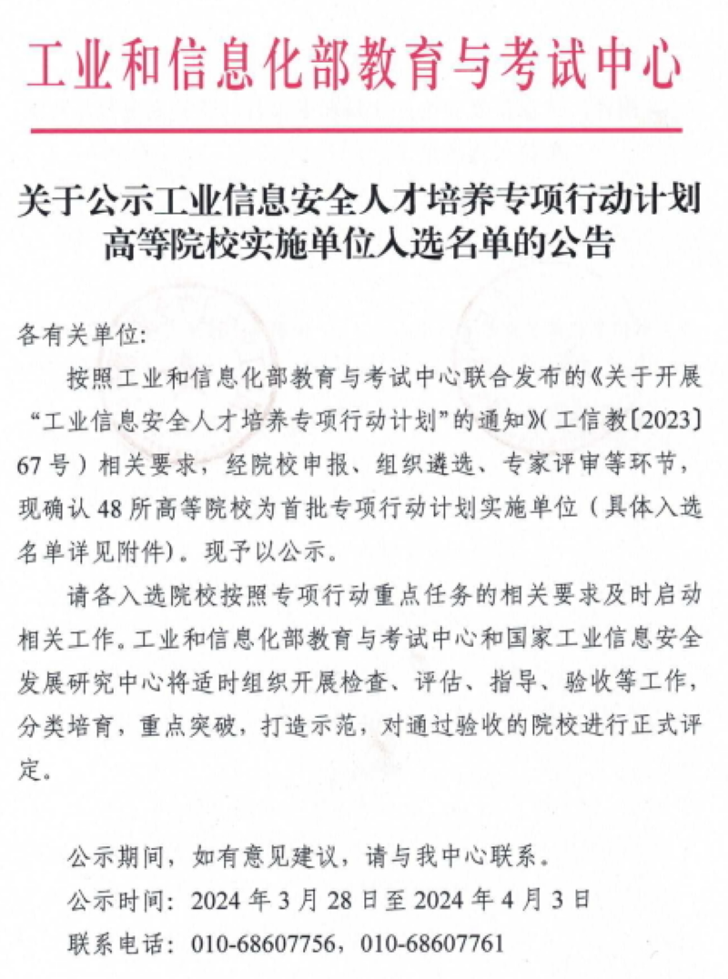 为深入贯彻落实党中央国务院关于促进网络安全产业发展、深化产教融合等决策部署,在学校领导和教务处指导下,2023年12月计算机科学与技术学院(软件学院、网络空间安全学院)组织专业负责人和骨干教师申报了工信部《工业信息安全人才培养专项行动计划》,经过组织遴选、分组答辩、专家评审等环节,太阳成官网与浙江大学、华中科技大学、东南大学等48所高校成功入选首批专项行动计划高等院校实施单位。