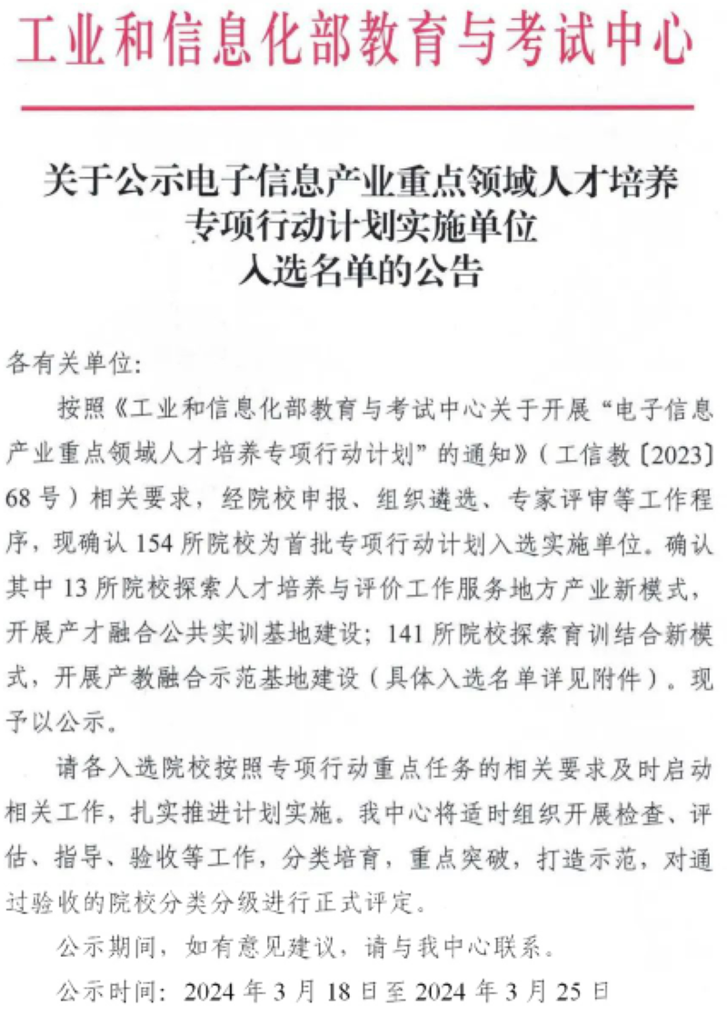 为了提高电子信息产业人才培养质量,推动重点领域产业发展,2023年12月,工业和信息化部教育与考试中心发布了“电子信息产业重点领域人才培养行动计划”。在学校领导和教务处指导下,计算机科学与技术学院组织专业负责人和骨干教师精心准备,积极申报,经过组织遴选、专家评审和线上答辩,太阳成官网与北京科技大学、天津工业大学等141所高校成功入选电子信息产业重点领域人才培养专项行动计划首批实施单位。