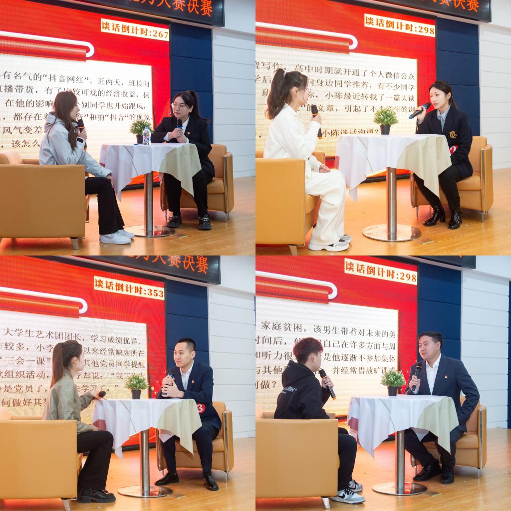 谈心谈话环节,辅导员现场抽题并随机匹配助演学生,以情景再现的方式围绕学生的思想教育、学业指导、寝室生活、个人情感、网络思政、就业创业等一系列相关问题展开深入细致的谈心谈话和循循善诱的教育引导,考察了辅导员对新时代学生特点、学生成长成才规律、学生思想政治教育规律的了解把握程度,以及对学生的教育引导能力、解决理论困惑和处理实际问题的能力等,展现出20名参赛选手的应急处突、临场应变能力、日常思想政治教育的风采和技巧。