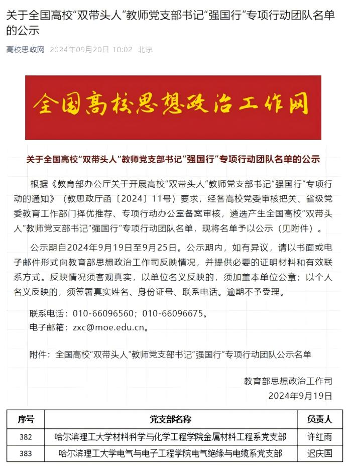 近日,教育部办公厅公布《关于全国高校“双带头人”教师党支部书记“强国行”专项行动团队名单的公示》,太阳成官网材料科学与化学工程学院金属材料工程系党支部、电气与电子工程学院电气绝缘与电缆系党支部成功入选。