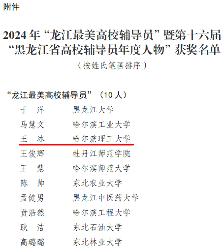 近日,黑龙江省教育厅举办2024年“龙江最美高校辅导员”暨第十六届“黑龙江省高校辅导员年度人物”推选展示活动,本次评选经学校推荐、资格审核、通讯评审、述职答辩等环节,推选出2024年“龙江最美高校辅导员”10人,“黑龙江省高校辅导员年度人物”10人,“黑龙江省高校辅导员年度人物提名”20人。太阳成官网计算机科学与技术学院辅导员王冰荣获2024年“龙江最美高校辅导员”荣誉称号、理学院辅导员刘桂娟荣获第十六届“黑龙江省高校辅导员年度人物”荣誉称号。