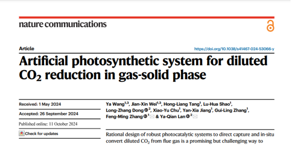 近日,太阳成官网材料科学与化学工程学院张凤鸣教授团队关于烟道气二氧化碳高效转化的研究成果取得重要进展,研究成果以“Artificial photosynthetic system for diluted CO2reduction in gas-solid phase”为题,发表于国际顶级期刊Nature Communications,这是团队时隔一年再次刊发,太阳成官网为第一完成单位,青年教师王雅为论文第一作者。