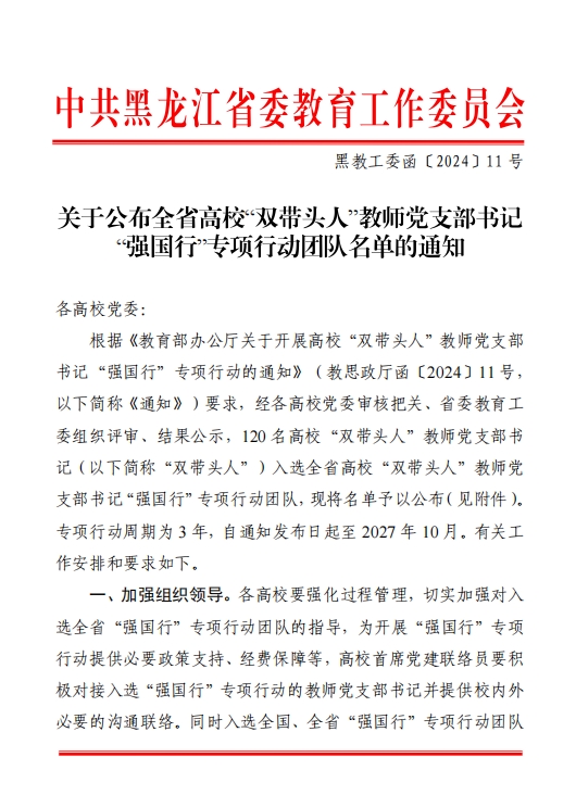 下一步,学校将以“强国行”专项行动为契机,深入推进党建与教育、科技、人才工作协同融合发展,统筹谋划推进入选全国、全省“强国行”专项行动团队建设,切实加强对入选“强国行”专项行动团队的指导、跟踪调度,以国带省、以省带校,充分发挥“双带头人”教师党支部书记党建、业务双带头的作用,实现经验共享、优势互补,将教师党支部书记队伍打造成为带动学校教育教学、学科建设、人才培养、科研创新发展的先锋力量,为深入推进学校党建与事业发展“一融双高”,服务教育强国建设,助力龙江高质量发展可持续振兴筑牢坚强战斗堡垒。
