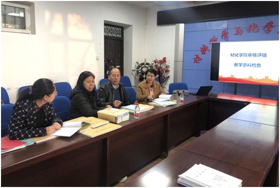 按照检查工作程序,检查组听取了董丽敏院长作的学院审核评估汇报,董丽敏从五个方面对审核评估工作做了汇报,并指出存在的问题及解决方法。随后检查组全体成员考察了学院部分教学实验室,认真查看实验室记录本,实验室安全制度、实验教学报告等材料。检查组分工明确,高效开展检查工作,分别与在校生、学院管理人员访谈,与院领导、专业教师访谈,查看纸质课程试卷、本科毕业设计、本科毕业设计日志、各系教研活动记录等支撑材料。之前检查组已完成听课看课,并对材化学院提交的电子版课程材料进行了认真检查。
