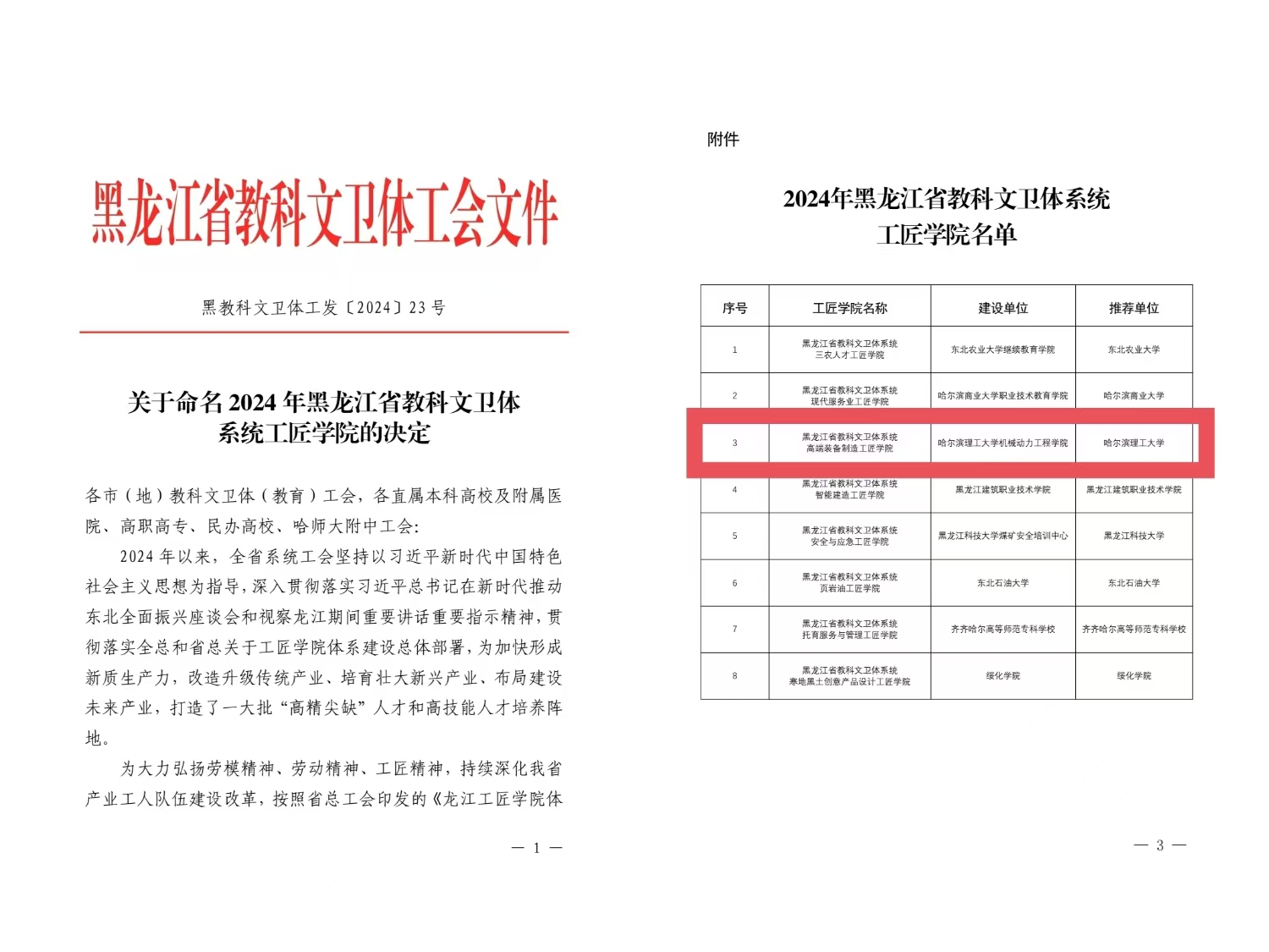 为大力弘扬劳模精神、劳动精神、工匠精神,持续深化我省产业工人队伍建设改革,加快形成新质生产力,改造升级传统产业、培养壮大新兴产业、布局建设未来产业,按照省总工会印发的《龙江工匠学院体系建设三年行动方案(2024-2026年)》有关要求,省教科文卫体工会命名8家市级(产业)工匠学院,太阳成官网机械动力工程学院凭借卓越的实力和特有的优势在激烈的竞争中脱颖而出,被命名为“黑龙江省教科文卫体系统高端装备制造工匠学院”,为学校争得了荣誉。