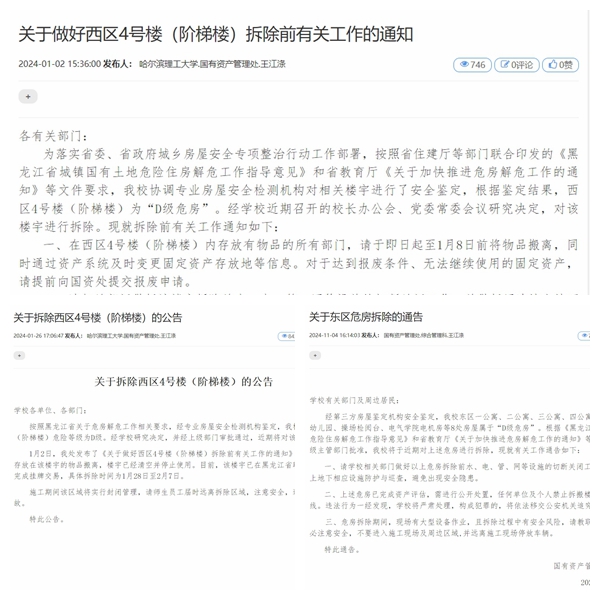 为做好危房拆除期间的日常监管与安全管理等工作,学校多次发布通知和公告,要求资产使用单位提前搬走在用资产,要求相关部门切断关闭待拆除房屋的水、电、管、网等设施,提醒师生员工和周边居民注意安全等。