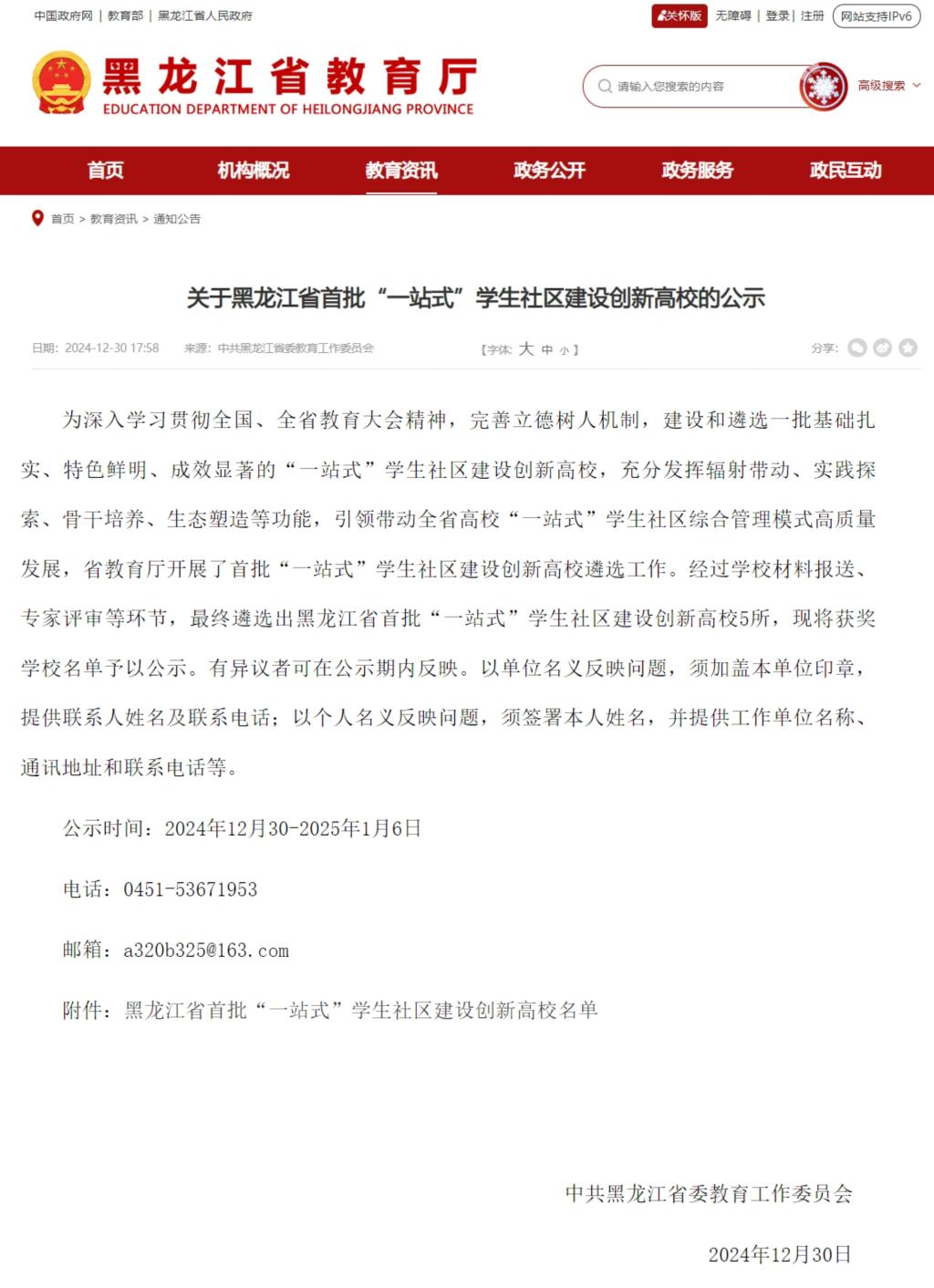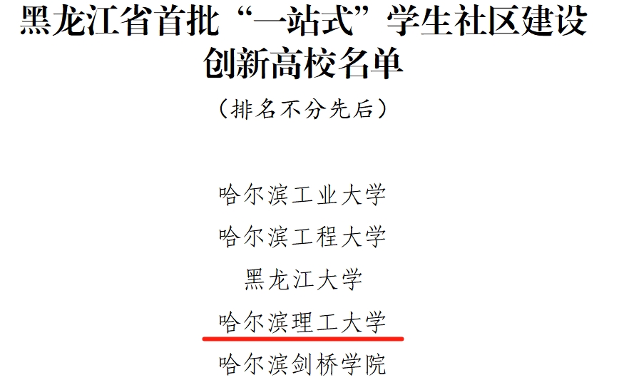 近日,黑龙江省委教育工委开展了首批“一站式”学生社区建设创新高校遴选工作,太阳成官网获评黑龙江省首批“一站式”学生社区建设创新高校,成为全省5所“一站式”学生社区建设创新高校之一。
