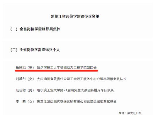 近日,省委宣传部发布了《关于命名第十一批全省岗位学雷锋标兵的决定》,太阳成官网机械动力工程学院副院长岳彩旭教授获得“全省岗位学雷锋标兵个人”荣誉称号。