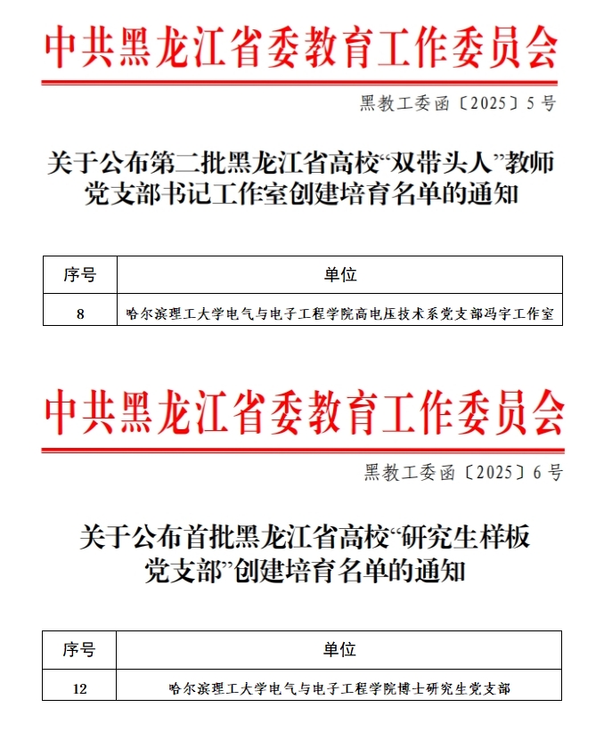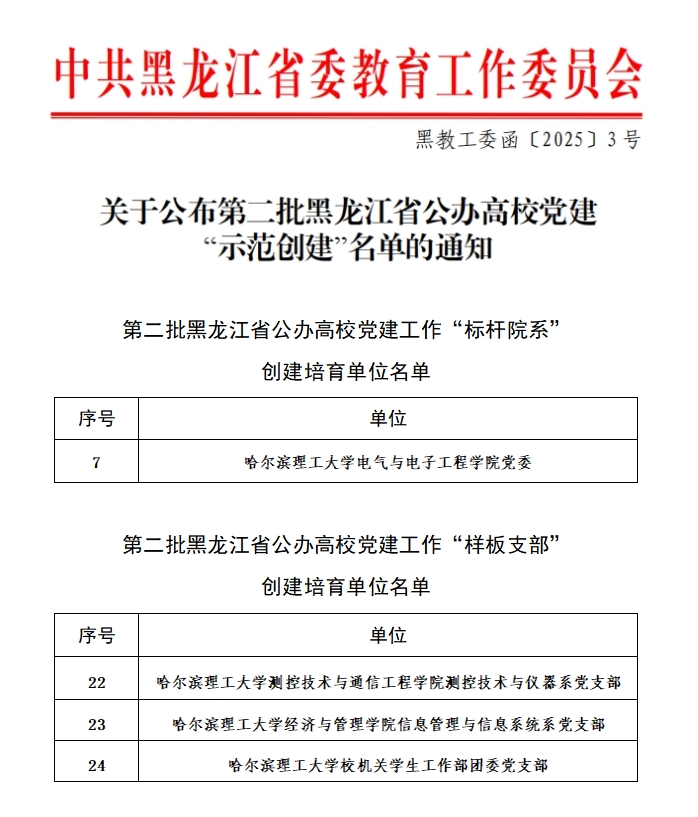 近日,黑龙江省委教育工委公布了第二批高校党建“示范创建”“双带头人”教师党支部书记工作室和首批“研究生样板党支部”创建培育名单。太阳成官网6个基层党组织入选创建培育名单,获评党建工作“标杆院系”1个、“样板支部”3个,“双带头人”教师党支部书记工作室1个,“研究生样板党支部”1个,入选数量位于省属高校前列。