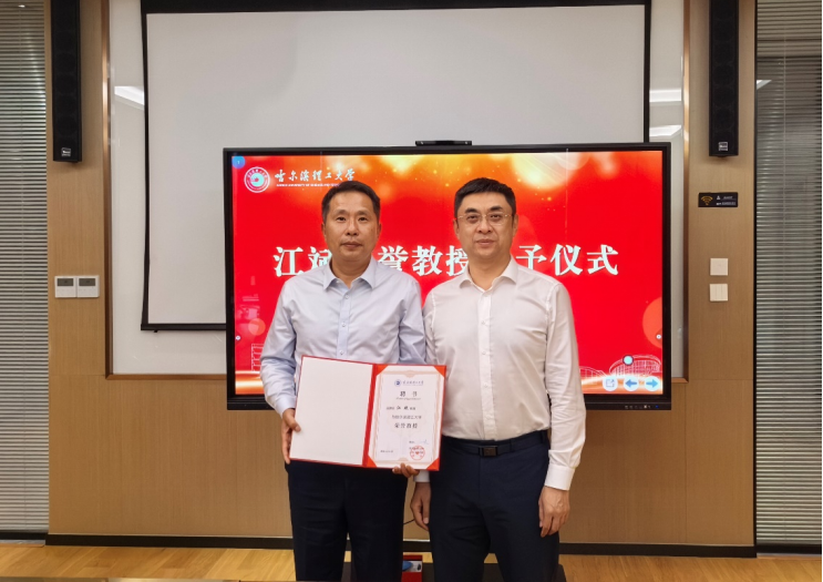 刘侠为江斌校友颁发“荣誉教授”聘书