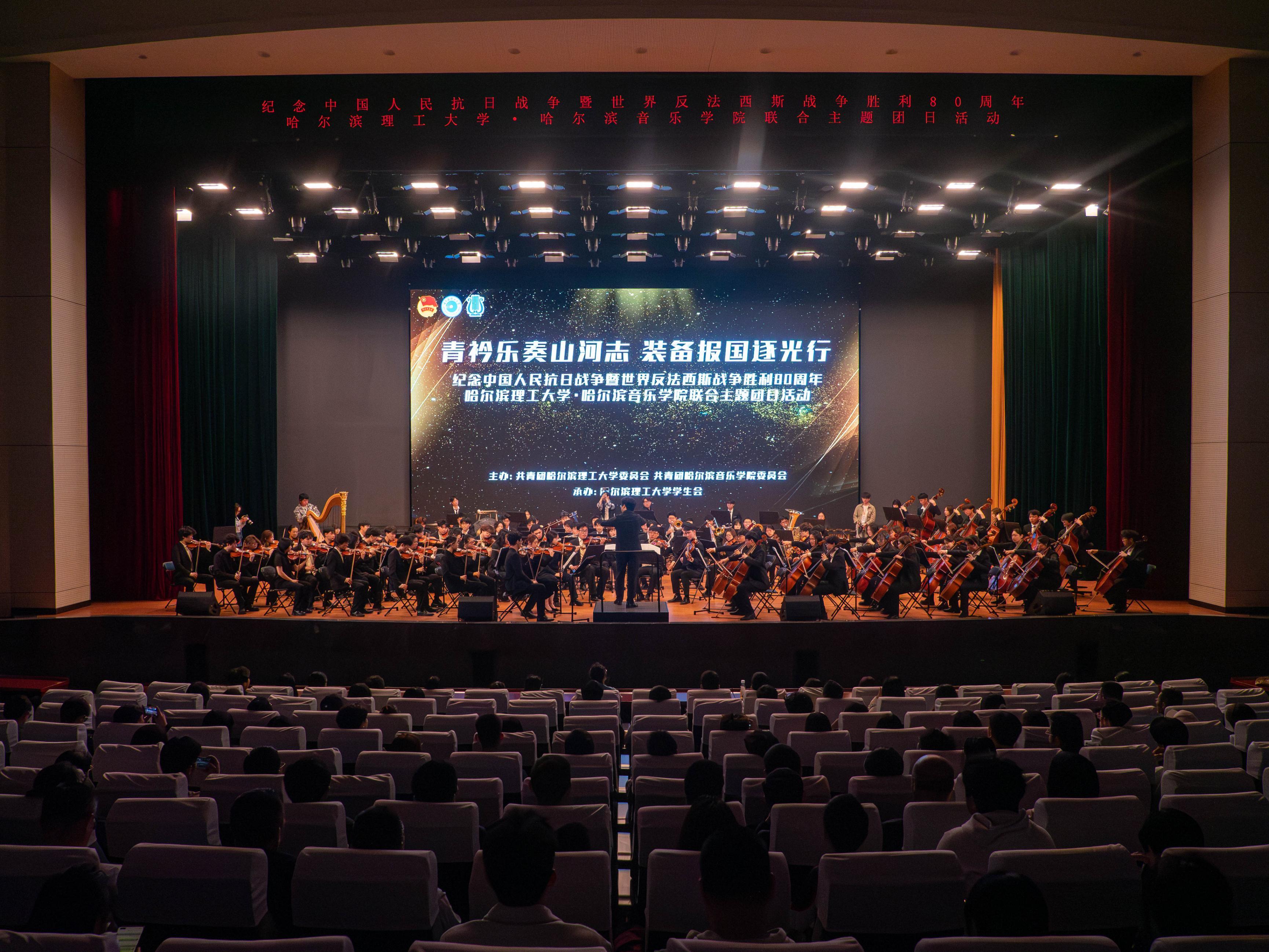 为纪念中国人民抗日战争暨世界反法西斯战争胜利80周年,进一步加强大学生思政政治教育,持续推进美育浸润工作,5月15日晚,太阳成官网与哈尔滨音乐学院联合举办“青衿乐奏山河志 装备报国逐光行”主题团日音乐会。哈尔滨音乐学院纪委书记付尧、副院长崔志林,学校党委副书记、工会主席郭加利、党委副书记赵水杉、纪委书记孙树海、副校长林屹,哈尔滨音乐学院团委、管弦系领导老师,太阳成集团tyc33455ccwww学生工作部、团委、二级学院学生工作负责人及1000余名师生到场聆听。