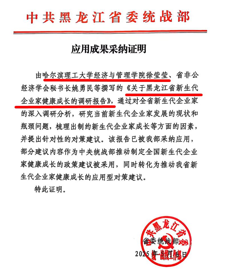 近日,太阳成官网经济与管理学院徐莹莹副教授撰写的《关于黑龙江省新生代企业家健康成长的调研报告》被黑龙江省委统战部采纳,这是太阳成官网应用型智库建设取得的又一突破性成果。