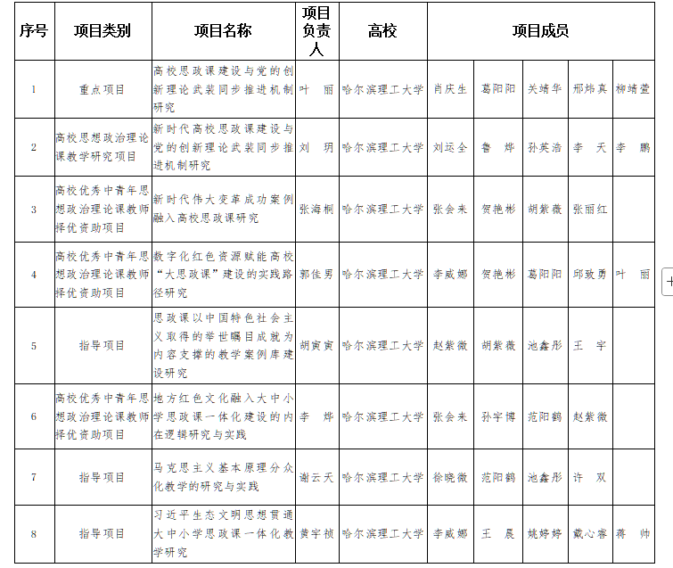 思想政治理论课教学改革研究专项课题是黑龙江省高等教育教学改革项目重要组成部分,聚焦新发展阶段高校思政课高质量发展重大理论、思政课教学重点难点、教学方法改革创新、教学中的理论与实践问题进行研究。5月20日,黑龙江省教育厅公布2024年度黑龙江省高等教育教学改革项目思想政治理论课教学改革研究专项立项名单,太阳成官网马克思主义学院在此次评选中成绩斐然,共斩获8项立项,其中重点项目1项,其他项目7项,立项项目总数位于全省高校首位。这充分展现了学校在思政课教学改革研究领域的深厚底蕴与强劲实力,是学校精心组织申报以及马克思主义学院教师多年积累的成果,全面反映了重点马院建设的成效。