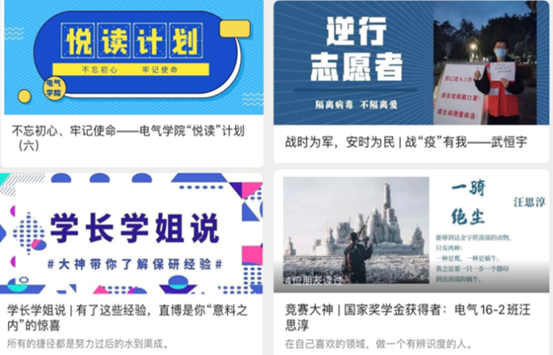 打造线上理论宣讲专题“初心学堂”“百名团干部讲团课”“听第四卷,学二十大”“我和我的祖国”“悦读计划”“铸魂育人工程”、“党史学习专题”等近10个理论宣讲专题,打造“身边”小课堂,打造“学长学姐说”“榜样力量-国奖获得者专访”“考研助力专栏”等发挥青年主动性创造性,融入青年之力强化网络阵地思想引领的力度、效度和强度。