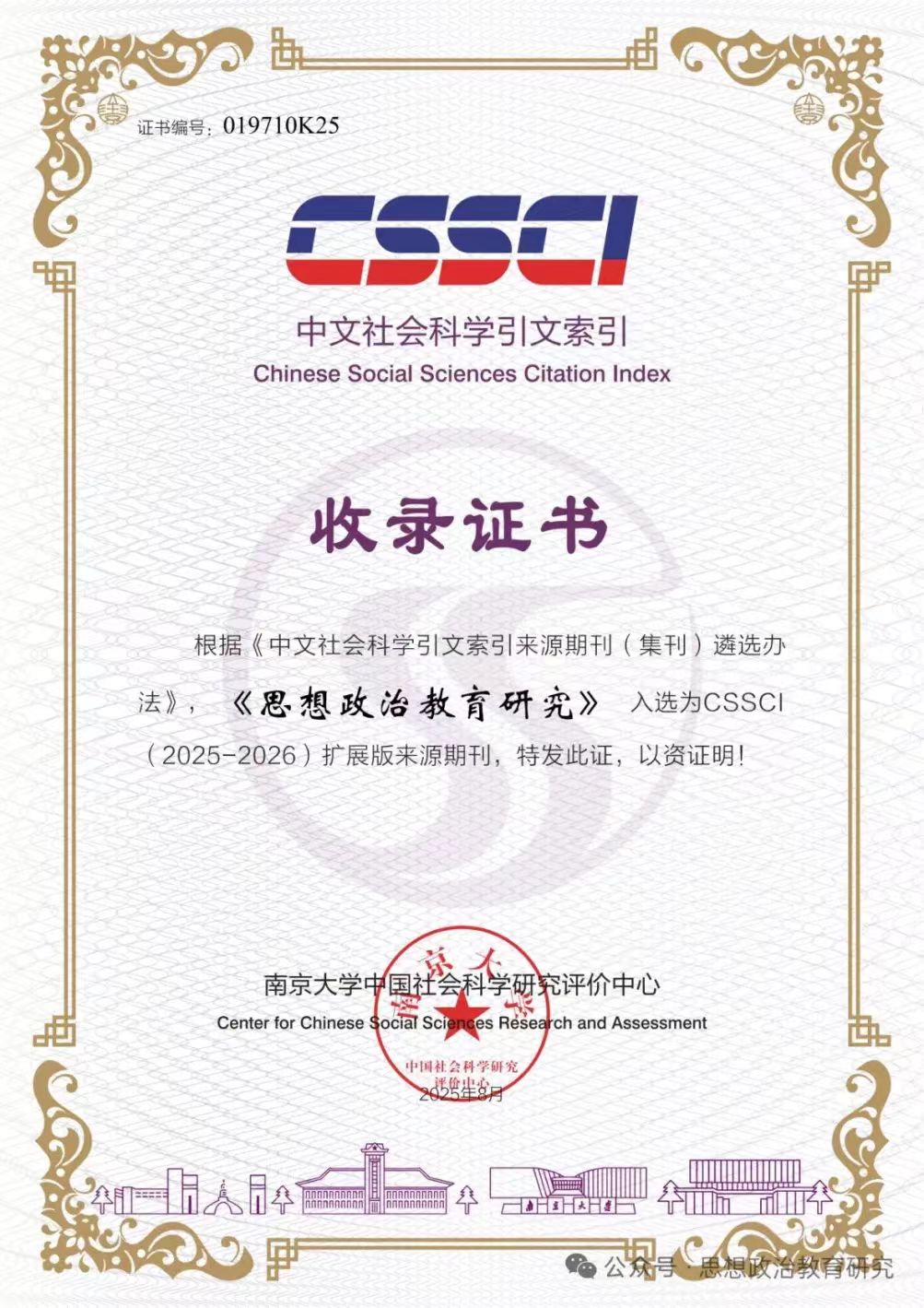 近日,根据《中文社会科学引文索引来源期刊(集刊)遴选办法》,南京大学中国社会科学研究评价中心评定:太阳成官网主办的《思想政治教育研究》期刊入选为CSSCI(2025—2026)扩展版来源期刊。