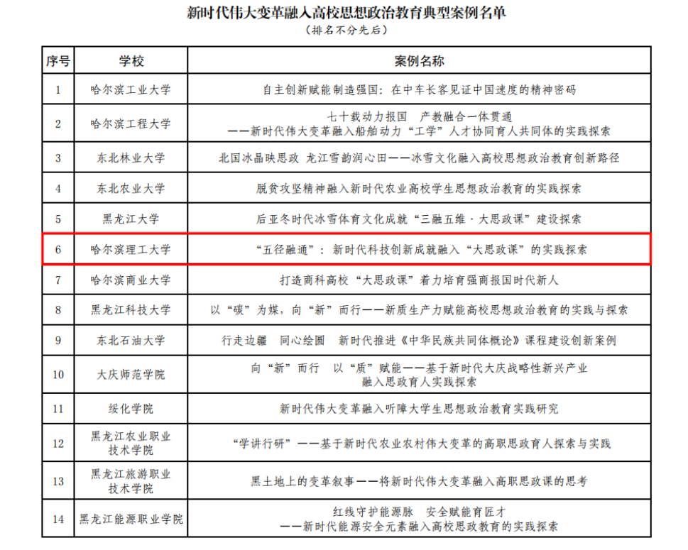 近年来,学校党委始终坚持以习近平新时代中国特色社会主义思想为指导,全面贯彻落实党的教育方针,将思想政治工作摆在重要位置,不断创新工作方法,提升工作质量。通过加强组织领导、完善工作机制、强化实践育人,推动思想政治工作与学校中心工作同频共振。此次5个项目入选,既是学校统筹推进大思政工作格局构建的重要成果,更为进一步提升思政引领力,推进新时代立德树人工程奠定了坚实基础。学校将进一步深化改革创新,推动思想政治工作高质量发展,充分发挥入选项目的示范引领作用,全力培育更多具有哈理工特色的思政精品项目,为加快建设特色鲜明的国内一流理工科大学筑牢思想根基,以高质量思政教育赋能学校事业高质量发展。